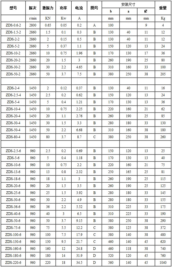 ZDS系列振動電機技術參數(shù):